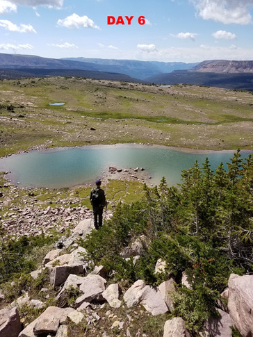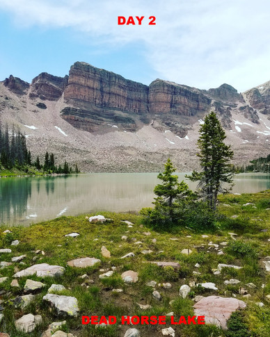 Approximately nine miles from the beginning of day two we reached our second camp at Dead Horse Lake. The land was lush and green, surrounded by pine trees and grassy land covered in flowers. The beautifully colored cliffs of Dead Horse Peak reigned high above. The lake, as most are in the Uinta range, was as a mirror. The cliffs and trees reflected as a perfect image on the lakes surface. There we stood gazing at the beauty surrounding us and the vertical cliffs that lead to our next destination. We contemplated how it could be possible for a human to safely traverse the path to the top. It seemed insanity to attempt a passage here, so we consulted our map. We found we were indeed looking up at the route and theorized where exactly the trail may take us. I fished for a couple hours while my cousin was resting after which I went to sleep myself.